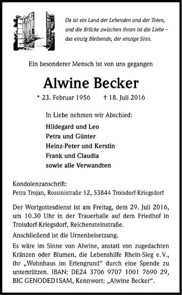 Liebe trauernde Angehörige von Alwine Becker,