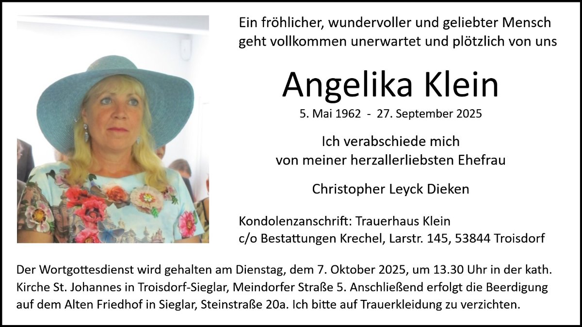 Hallo liebe Angelika, es hat mich sehr erschüttert von dieser Nachricht . Habe es von meiner Mutter erfahren. Wir sind zusammen in der Schule gewesen, du warst meine beste Freundin, sind zusammen in Haus Rott geritten. Wir haben den gleichen Beruf (PTA) . Wir waren immer für einander da. Dann bin ich nach Brühl gezogen, habe geheiratet und dann haben wir uns aus den Augen verloren. Ich habe oft an dich gedacht.