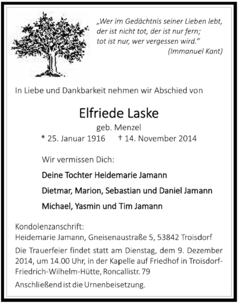 Elfriede Laskegestorben am 14. November 2014