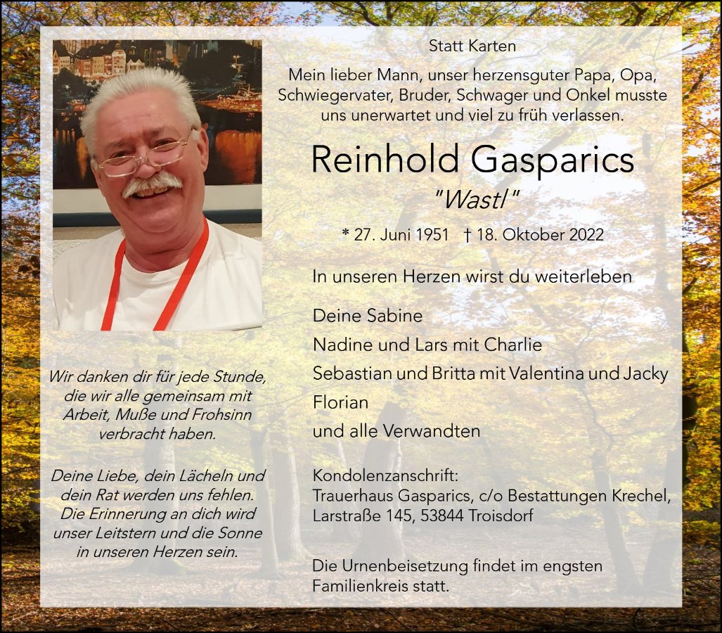 Liebe Familie Gasparics, mein aufrichtiges Beileid und viel Kraft für die Zukunft.